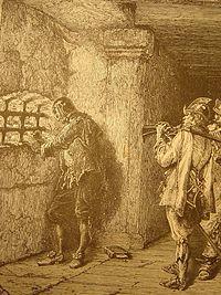 - Alfred de Vigny, "The Prison" (1821),[19] a long poem describing the final events in the life of the Man in the Iron Mask. An aged priest is called to offer the last rites of the Catholic Church to a mysterious prisoner. After an involved process to ensure the prisoner's anonymity, the priest is introduced to the dying prisoner, who is addressed as "my prince" by the jailer. The priest realizes in the dim light that the prisoner wears an iron mask, and recalls the tales he heard in his youth. The prisoner rejects the priest's efforts, even after the priest promises that his lifelong incarceration has already opened Heaven to him if he would only embrace God. The prisoner dies without repenting. The priest continues to pray for the man for several hours, and is horrified to see that the corpse continues to wear the mask underneath the shroud, denied release even in death.
