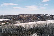 Modern-day Manitoba was inhabited by the First Nations people shortly after the last ice age glaciers retreated in the southwest about 10,000 years ago; the first exposed land was the Turtle Mountain area.[36] The Ojibwe, Cree, Dene, Sioux, Mandan, and Assiniboine peoples founded settlements, and other tribes entered the area to trade. In Northern Manitoba, quartz was mined to make arrowheads. The first farming in Manitoba was along the Red River, where corn and other seed crops were planted before contact with Europeans.[37]