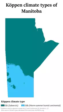 The province's northern sections (including the city of Thompson) fall in the subarctic climate zone (Köppen climate classification Dfc). This region features long and extremely cold winters and brief, warm summers with little precipitation.[24] Overnight temperatures as low as −40 °C (−40 °F) occur on several days each winter.[24]