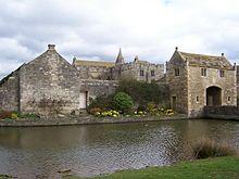 Although not typically built with strong fortifications as were castles, many manor-houses were fortified, which required a royal licence to crenellate. They were often enclosed within walls or ditches which often also included agricultural buildings. Arranged for defence against roaming bands of robbers and thieves,[1] in days long before police, they were often surrounded by a moat with a drawbridge,[1] and were equipped with gatehouses and watchtowers, but not, as for castles, with a keep, large towers or lofty curtain walls designed to withstand a siege. The primary feature of the manor house was its great hall, to which subsidiary apartments were added as the lessening of feudal warfare permitted more peaceful domestic life.