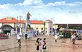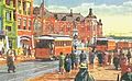 JGR Manseibashi Station in the original design. The view is from the street side, looking north-east, showing trams on the street. The Chūō Main Line is on the river side, mostly hidden behind the buildings, but it emerges behind the station building and continues to Kanda in the east (right); this dates the image to between early 1919 and September 1923.
