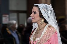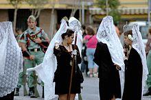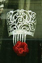 A mantilla is a traditional Spanish lace or silk veil or shawl worn over the head and shoulders, often over a high comb called a peineta, popular with women in Spain.[1] It is also worn, without the peineta, by Eastern Orthodox women in Russia, often white, with the ends crossed over neck and draped over the opposite shoulder. The shape, design and use are different from an ordinary veil.