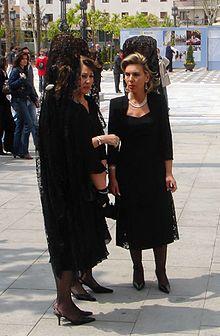 In Spain, women still wear mantillas during Holy Week (the week leading to Easter), bullfights and weddings. Also a black mantilla is traditionally worn when a woman has an audience with the Pope and a white mantilla is appropriate for a church wedding, but can be worn at other ceremony occasions as well. In accordance with what is known as the privilège du blanc only the queen of Spain and selected other Catholic wives of Catholic sovereigns can wear a white mantilla during an audience with the Pope.
