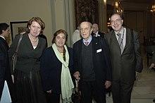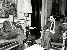 To his opponents he always was a dinosaur from the Franco regime.[19] He was a keen follower of Carl Schmitt's ideas,[20] and granted the German political theorist honorary membership to the Institute of Political Studies in 1962,[21] in a ceremony where he praised him as a "revered master".[22] Fraga identified himself with the figure of Antonio Cánovas del Castillo in 1976 for the first time; this idea of identification between Cánovas and Fraga was reinforced by historiographical trends close to Fraga in the 1980s in order to commend his figure.[23] Despite their political differences, he developed a close friendship with Fidel Castro,[24] himself of Galician descent, who met with Fraga in Galicia during a visit to Spain in 1992.[25]