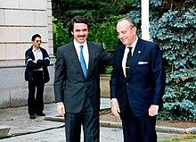 Manuel Fraga Iribarne (Spanish pronunciation: [maˈnwel ˈfɾaɣa iɾiˈβaɾne]; 23 November 1922 – 15 January 2012) was a Spanish professor and politician in Francoist Spain, who was also the founder of the People's Party. Fraga was Minister of Information and Tourism between 1962 and 1969, Ambassador to the United Kingdom between 1973 and 1975, Minister of the Interior in 1975, Second Deputy Prime Minister between 1975 and 1976, President of the People's Alliance/People's Party between 1979 and 1990 and President of the Regional Government of Galicia between 1990 and 2005. He was also a Member of the Congress of Deputies and a Senator.