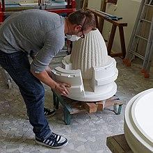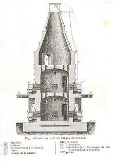 The kilns consist of a cylindrical body separated into three levels. The lowest is called the "first laboratoire" and is 2.6 m in diameter and 3 m tall. The middle level is called the "second laboratoire" and is 2.6 metres in diameter and 2 metres high. The top level is the 2-metre-high chimney cone. The firebox is an opening at the bottom of the first laboratoire, 1 metre high, 0.58 metres wide and 0.29 metres deep.[12] In the vault between the first and second laboratoires, is a large flue at the centre and 9 small ones around the edge. These flues serve to guide the flames and release the heated gas. Grills, called "flue-guards" are arranged to divide the flames. At the base of the second laboratoire, a little fire box helps to increase the temperature further. The oven contains four fireboxes for distributing the heat effectively.