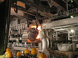 A ladle pouring molten steel into a Basic Oxygen Furnace for secondary steelmaking, inside a steel mill factory in Germany
