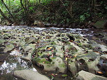 A prior theory states that the former name (Chinese: 皺空; Pe̍h-ōe-jī: jiâu-khang; lit. 'roughness-holes'; also 皺孔; jiâu-kháng) refers to pothole formations. A recent publication suggests that the valley area was overrun with masked palm civet and hence its former Hokkien name (貓面; bâ-bīn; 'cat surface'). During Japanese rule the name was recorded as Bakan (Japanese: 猫空),[2] which in Hokkien could be read bâ-khang, likely referring to the presence of the civets (bâ) in the valley (khang).[3]