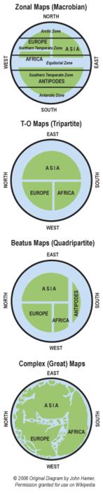 T-O maps, unlike zonal maps, illustrate only the habitable portion of the world known to medieval Europeans, limiting their perspective to a relatively small portion of the Earth's northern hemisphere.[2] The landmass was illustrated as a circle (an "O") divided into three portions by a "T". These three divisions were the continents of Asia, Africa and Europe. The popularity of the Macrobian maps and the combination of T-O style continents on some of the larger Macrobian spheres illustrate that Earth's sphericity continued to be understood among scholars during the Middle Ages.