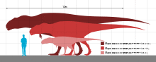 Holtz estimated the maximum size of the animal at 12.6 meters (41 ft).[2] This estimate has been cited in Drew Eddy and Julia Clarke (2011),[3] and cited again in a phylogenetic table in a 2014 analysis by Canale et al.[4] Gregory Paul gave a lower estimation of 11.5 meters (37.7 ft) and 5 metric tons (5.5 short tons).[5]