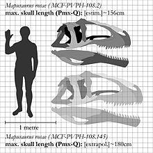 - ^ a b c Canale, Juan Ignacio; Novas, Fernando Emilio; Salgado, Leonardo; Coria, Rodolfo Aníbal (December 1, 2015). "Cranial ontogenetic variation in Mapusaurus roseae (Dinosauria: Theropoda) and the probable role of heterochrony in carcharodontosaurid evolution". Paläontologische Zeitschrift. 89 (4): 983–993. doi:10.1007/s12542-014-0251-3. ISSN 0031-0220. S2CID 133485236.