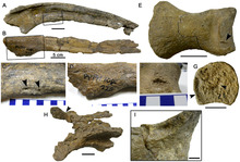 Paleontologist Rodolfo Coria, of the Museo Carmen Funes, contrary to his published article, repeated in a press-conference earlier suggestions that this congregation of fossil bones may indicate that Mapusaurus hunted in groups and worked together to take down large prey, such as the immense sauropod Argentinosaurus.[6] If so, this would be the first substantive evidence of gregarious behavior by large theropods other than Tyrannosaurus, although whether they might have hunted in organized packs (as wolves do) or simply attacked in a mob, is unknown. The authors interpreted the depositional environment of the Huincul Formation at the Cañadón del Gato locality as a freshwater paleochannel deposit, "laid down by an ephemeral or seasonal stream in a region with arid or semi-arid climate".[1] This bone bed is especially interesting, in light of the overall scarcity of fossilized bone within the Huincul Formation. An ontogenetic study by Canale et al (2014)[4] found that Mapusaurus displayed heterochrony, an evolutionary condition in which the animals may retain an ancestral characteristic during one stage of their life, but lose it as they develop. In Mapusaurus, the maxillary fenestrae are present in younger individuals, but gradually disappear as they mature.