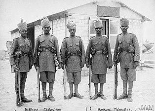 The Maratha Light Infantry is a light infantry regiment of the Indian Army. It traces its lineage to the Bombay Sepoys, raised in 1768, making it the most senior light infantry regiment in the Indian Army. The class composition of the regiment was and is primarily formed by Maratha recruits from the former Maratha Empire. The men are mostly drawn from all over the state of Maharashtra, with some percentage from Marathi-speaking areas of Karnataka including Coorg.[2] The regimental centre has been in Belgaum, Karnataka, since 1922, which was part of the Bombay Presidency at that time.[3] The battle cry of Maratha Light Infantry is, "Bola Shri Chhatrapati Shivaji Maharaj Ki Jai (Say Victory To King Shivaji)". The regiment has won over 60 battle honours, including 21 in World War I.