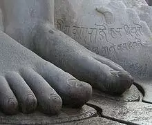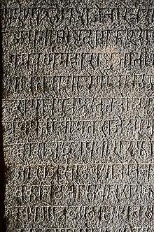 The earliest example of Maharashtri as a separate language dates to approximately 3rd century BCE: a stone inscription found in a cave at Naneghat, Junnar in Pune district had been written in Maharashtri using Brahmi script. A committee appointed by the Maharashtra State Government to get the Classical status for Marathi has claimed that Marathi existed at least 2300 years ago alongside Sanskrit as a sister language.[25] Marathi, a derivative of Maharashtri, is probably first attested in a 739 CE copper-plate inscription found in Satara. Several inscriptions dated to the second half of the 11th century feature Marathi, which is usually appended to Sanskrit or Kannada in these inscriptions.[26] The earliest Marathi-only inscriptions are the ones issued during the Shilahara rule, including a c. 1012 CE stone inscription from Akshi taluka of Raigad district, and a 1060 or 1086 CE copper-plate inscription from Dive that records a land grant (agrahara) to a Brahmin.[27] A 2-line 1118 CE Marathi inscription at Shravanabelagola records a grant by the Hoysalas. These inscriptions suggest that Marathi was a standard written language by the 12th century. However, there is no record of any literature produced in Marathi until the late 13th century.[28]
