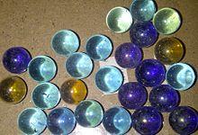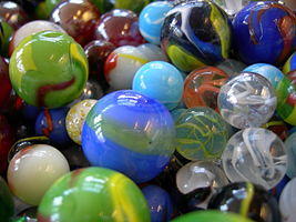A marble is a small spherical object often made from glass, clay, steel, plastic, or agate. These balls vary in size. Most commonly, they are about 13 mm (1&fras1;2 in) in diameter, but they may range from less than 1 mm (1&fras1;30 in) to over 8 cm (3 in), while some art glass marbles for display purposes are over 30 cm (12 in) wide. Marbles can be used for a variety of games called marbles. They are often collected, both for nostalgia and for their aesthetic colors. In the North of England the objects and the game are called "taws", with larger taws being called bottle washers after the use of a marble in Codd-neck bottles, which were often collected for play. These toys can be used to make marble runs, a form of art, or they can be used in marble races, a type of race using marbles.