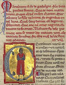 Forty-four poems are attributed to Marcabru, learned, often difficult, sometimes obscene, relentlessly critical of the morality of lords and ladies. He experimented with the pastorela, which he uses to point out the futility of lust. One tells of how the speaker's advances are reviled by a shepherdess on the basis of class. Another tells of how a man's attempt to seduce a woman whose husband was at the crusades is firmly rebuffed. He may also have originated the tenso in a debate with Uc Catola (as early as 1133) on the nature of love and the decline of courtly behaviour.[4] Marcabru was a powerful influence on later poets who adopted the obscure trobar clus style. Among his patrons were William X of Aquitaine and, probably, Alfonso VII of León. Marcabru may have travelled to Spain in the entourage of Alfonso Jordan, Count of Toulouse, in the 1130s. In the 1140s he was a propagandist for the Reconquista and in his famous poem with the Latin beginning Pax in nomine Domini! he called Spain a lavador (washer) where knights could go to have their souls cleansed fighting the infidel.[5]