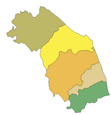 After the referendum of 2006, 7 municipalities of Montefeltro were detached from the Province of Pesaro and Urbino to join the Province of Rimini (Emilia-Romagna) on 15 August 2009.[11][12] The municipalities are Casteldelci, Maiolo, Novafeltria, Pennabilli, San Leo, Sant'Agata Feltria and Talamello.