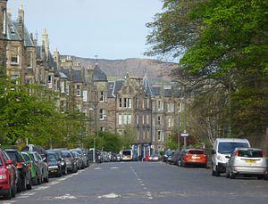 The area was developed as a planned middle-class suburb by Sir George Warrender, the owner of Bruntsfield House and the surrounding estate (which was also known as the Warrender Park) in the middle of the 19th century. This was at a time of rapid population growth in Edinburgh, stimulating a significant increase in the demand for housing. The original feuing plan laid out by architect David Bryce in 1869 called for mainly terraced villas, with a number of large, detached villas on Marchmont Road.[2] However, this was superseded by a more comprehensive plan prepared by the firm of John Watherston & Sons. This proposed that all buildings were to be four- or five-storey tenements, some with commercial premises on the ground floor frontages.[3][4]