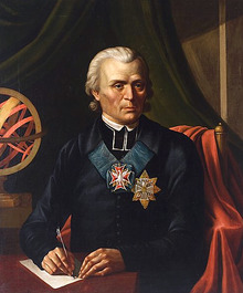 Marcin Odlanicki Poczobutt was born in the village of Słomianka (since 1945 in Belarus) near Grodno. He studied at Vilnius University (1745–1751) and Charles University in Prague (1754–1756). With brief interruptions he lectured at Vilnius University from 1753 to 1808.[1] Sponsored by Michał Fryderyk Czartoryski, he further studied in France, Italy, and Germany from 1762 to 1764. His stay at the Marseille Observatory under Esprit Pézenas inspired him to devote his career to astronomy.[2] He earned doctorate of philosophy, gained professorship, and became director of the Vilnius Astronomical Observatory in 1764.[1] The observatory, established by Thomas Zebrowski, was in its early stages of development and Poczobutt worked hard to obtain modern instruments. Despite suppression of the Jesuits in 1773, the observatory gained royal favour from King Stanisław August Poniatowski—it was named royal observatory and Poczobutt became King's astronomer.[2] In 1780, Poczobutt was appointed as university rector by the Commission of National Education. He was tasked with reforming the university from a medieval school concentrated on humanities (philosophy and theology) to a modern scientific institution.[3] Under Poczobutt the university improved its science, medicine, and law departments.[4] As rector of the university he promoted the use of Latin and opposed any use of Polish or Lithuanian languages.[3]