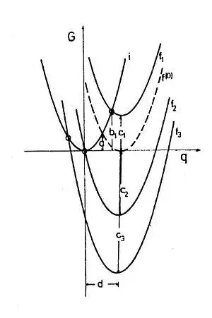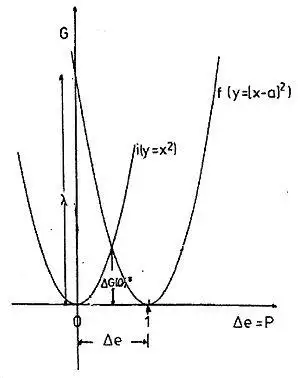Where r1 and r2 are the radii of the spheres and R is their separation, εs and εopt are the static and high frequency (optical) dielectric constants of the solvent, Δe the amount of charge transferred. The graph of G vs. Δe is a parabola (Fig. 1). In Marcus theory the energy belonging to the transfer of a unit charge (Δe = 1) is called the (outer sphere) reorganization energy λo, i.e. the energy of a state where the polarization would correspond to the transfer of a unit amount of charge, but the real charge distribution is that before the transfer.[11] In terms of exchange direction the system is symmetric.