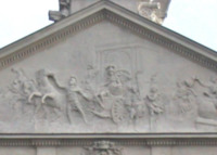 Bonfini also provided the Hunyadis with the epithet Corvinus. This was supposedly due to a case in which the tribune, Marcus Valerius Corvus in 349 BC, while on the battlefield, accepted a challenge to single combat issued to the Romans by a barbarian warrior of great size and strength. Suddenly, a raven flew from a trunk, perched upon his helmet, and began to attack his foe's eyes with its beak so fiercely that the barbarian was blinded and the Roman beat him easily. In memory of this event, Valerius' agnomen Corvinus (from Corvus, "Raven") was interpreted as derived from this event. The Hunyadis called themselves "Corvinus" and had their coins minted displaying a "raven with a ring". This was later taken up in the coat of arms of Polish aristocratic families connected with the Hunyadis, and also led to Marcus Valerius Messalla Corvinus' triumph over the Aquitanians (27 BC) being commemorated in the pediment of the Krasiński Palace in Warsaw.