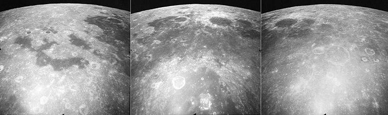 These are three views of Mare Marginis, taken by the mapping camera of the Apollo 17 mission in 1972, facing north-northeast from an average altitude of 124 km. At the right is the east side of Mare Marginis, with the craters Jansky, Jansky F, and the elongated Jansky D in the foreground, and the eastern mare is in the upper left. The center photo shows the central mare with the prominent crater Goddard surrounded by light materials, the crater Ibn Yunus immediately to its east, Goddard C to the west, half of the large crater Neper in the foreground, and the crater Hubble far to the north near the horizon. The swirls of light material in the mare, thought to be caused by magnetic fields, are visible in this photo. The left photo shows the western mare (more easily visible from Earth), with disconnected "lakes" of basalt, and the crater Cannon. These photos were taken within minutes of each other as the Command Module America orbited the moon.