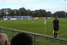The stadium in Hartsdown Park has been Margate's home since 1929,[44] the club having played at at least six grounds before moving to Hartsdown Park,[45] the same year the park itself opened to the public.[46] Little development of the stadium took place until 2002, when the club launched an ambitious scheme to completely redevelop the site.[47] The club moved out and the old stadium, which was constructed mainly from timber and corrugated iron,[48] was demolished in early 2003, but the local council disputed the plans submitted.[49] Although planned to be completed by August 2003, the redevelopment dragged on for three years, mired in issues regarding planning permission for the commercial facilities the club wanted to build in addition to the stadium itself.[47][50] The team spent three years ground-sharing with other Kent clubs, but club officials' failure to confirm a return date to Hartsdown led to Margate's expulsion from the Conference National in 2004.[5][51] In 2005 the club was finally able to return to the ground, albeit with pre-fabricated stands and temporary buildings in place.[47] In 2014, the club applied to the local council for permission to erect six new temporary stands.[52]
