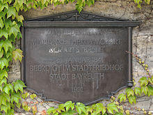 Fifty years after her famous cousin, Marianne died in Bayreuth, Germany, at the age of 82. In her estate, the portrait of her cousin was found, which he had sent her from Mannheim in 1778. Only 15 months later, her 58-year-old daughter died. Both were buried in the municipal cemetery in Bayreuth, but the graves can no longer be found. In the course of the years, two memorial plates were placed, one at the Old Coaching House, the other at the entrance of the municipal cemetery.