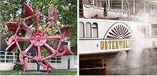 The paddle wheel is a large wheel, generally built of a steel framework, upon the outer edge of which are fitted numerous paddle blades (called floats or buckets). The bottom quarter or so of the wheel travels underwater. Rotation of the paddle wheel produces thrust, forward or backward as required. More advanced paddle wheel designs have featured feathering methods that keep each paddle blade oriented closer to vertical while it is in the water; this increases efficiency. The upper part of a paddle wheel is normally enclosed in a paddlebox to minimise splashing.