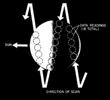 The microwave radiometer made three scans of Venus in 35 minutes on December 14, 1962 starting at 18:59 UTC.[11] The first scan was made on the dark side, the second was near the terminator, and the third was located on the light side.[11][21] The scans with the 19 mm band revealed peak temperatures of 490 ± 11 K (216.9 ± 11.0 °C; 422.3 ± 19.8 °F) on the dark side, 595 ± 12 K near the terminator, and 511 ± 14 K on the light side.[22] It was concluded that there is no significant difference in temperature across Venus.[11][21] However, the results suggest a limb darkening, an effect which presents cooler temperatures near the edge of the planetary disk and higher temperatures near the center.[9][10][11][21][22][23] This also supported the theory that the Venusian surface was extremely hot or the atmosphere optically thick.[11][21][22]