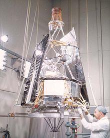 The Mariner 2 spacecraft was designed and built by the Jet Propulsion Laboratory of the California Institute of Technology.[6] It consisted of a hexagonal base, 1.04 meters across and 0.36 meters thick, which contained six magnesium chassis housing the electronics for the science experiments, communications, data encoding, computing, timing, and attitude control, and the power control, battery, and battery charger, as well as the attitude control gas bottles and the rocket engine. On top of the base was a tall pyramid-shaped mast on which the science experiments were mounted, which brought the total height of the spacecraft to 3.66 meters. Attached to either side of the base were rectangular solar panel wings with a total span of 5.05 meters and width of 0.76 meters. Attached by an arm to one side of the base and extending below the spacecraft was a large directional dish antenna. The power system of Mariner 2 consisted of two solar cell wings, one 183 cm by 76 cm and the other 152 cm by 76 cm (with a 31 cm dacron extension (a solar sail) to balance the solar pressure on the panels), which powered the craft directly or recharged a 1000 watt-hour sealed silver-zinc cell battery. This battery was used before the panels were deployed, when the panels were not illuminated by the Sun, and when loads were heavy. A power-switching and booster regulator device controlled the power flow. Communications consisted of a 3-watt transmitter capable of continuous telemetry operation, the large high gain directional dish antenna, a cylindrical omnidirectional antenna at the top of the instrument mast, and two command antennas, one on the end of either solar panel, which received instructions for midcourse maneuvers and other functions.