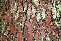 The bark is orange-red, thick, and deeply fissured at the base of the trunk, somewhat thinner in the upper crown.