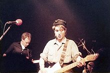 The Fall were named after the novel by Albert Camus, and initially consisted of Smith and his friends Martin Bramah, Una Baines and Tony Friel.[13] By this time, Smith was unemployed, having dropped out of college at the age of 19.[14] He gave up his job as a shipping clerk at Salford docks shortly afterward to devote his full energies to the band. Their early line-up was formed from early members of the punk rock movement. However their music underwent numerous stylistic changes, often concurrently with changes in the group's lineup. The Fall's 40-year career can be broken into five broad periods, based on the band's membership. These include their early late 1970s line-up, the classic Fall period of Hanley and dual drummers, the Brix years of 1984-89, their early 1990s revival, and everything after the on-stage fight in New York, after which Hanley quit and Smith was arrested (see below).[15]