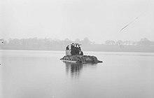Already a bulky vehicle — the probable reason the Mark IX was selected as the basis for an amphibious tank — its displacement was improved by fitting drums at the front and sides. Long wooden boards were attached to the track links but at one side of the board only; as they reached the curve of the track they would project, acting as paddles. Pictures were made of a floating tank in Hendon Reservoir on 11 November 1918, the day of the Armistice. According to oral tradition, this vehicle was named The Duck but there are doubts as to its veracity. The photographs show that a large rectangular superstructure had been placed around the cab and from this superstructure pipes projected upwards, likely the outlets of bilge pumps. The vehicle was for the occasion manned by Navy personnel.[5]