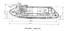As there was no time for a completely new design, the Mark IX was based on the Mark V, with the hull lengthened to 9.73 m (31 ft 11 in). The 150 hp Ricardo engine was moved to the front, the gearbox to the back and the suspension girders left out entirely. This created an inner space 4 m (13 ft 1 in) long and 2.45 m (8 ft 0 in) wide, enough room for thirty (officially even fifty) soldiers or ten tons of cargo. To ensure sufficient stiffness for the chassis, the floor was reinforced by heavy transverse girders. The infantry inside had to contend with the control rods for the gears running along the roof and the drive shaft through the middle. Unfortunately for the infantrymen, no seats were built in for them in the tank.[4]