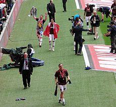 During the 2011–12 season with West Ham now back in the Championship, Noble scored eight goals, seven of which were penalties,[14] his only goal from open play coming in a 4–0 away win against Barnsley.[34] Having twice previously been runner-up, Noble was named Hammer of the Year for the 2011–12 season.[35] In May 2012 Noble played in the 2012 Football League Championship play-off Final at Wembley Stadium against Blackpool which West Ham won 2–1 to return to the Premier League after a one-year absence.[36] By the end of the season, he had played 49 games in all competitions, missing just one of their Championship games.[14]