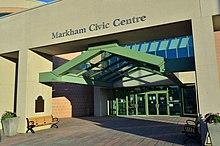 The Markham Civic Centre is the city hall of the city of Markham, Ontario. The brick and glass Civic Centre was designed by architect Arthur Erickson with Richard Stevens Architects Limited and opened on May 25, 1990. Entrances, except the great hall entrance, are named after communities in Markham (Unionville, Milliken, Thornhill). The building is adjacent to an 11.5-hectare park with a large pond reflecting the south façade.