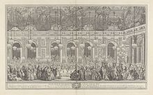 By March, she was the king's mistress, installed at Versailles in an apartment directly above his.[17] On 7 May, the official separation between her and her husband was pronounced.[4] To be presented at court, she required a title. The king purchased the marquisate of Pompadour on 24 June and gave the estate, with title and coat-of-arms, to Jeanne Antoinette, making her a Marquise.[4] On September 14 1745, Madame de Pompadour made her formal entry before the King, presented by the king's cousin, the Princess de Conti.. Determined to make her place at court secure, Pompadour immediately attempted to forge a good relationship with the royal family. After the Queen engaged Pompadour in conversation by enquiring after a mutual acquaintance, Madame de Saissac, Pompadour responded in delight, swearing her respect and loyalty to Marie Leszczyńska. Pompadour quickly mastered the highly mannered court etiquette; however her mother died on Christmas Day of the same year, and did not live to see her daughter's achievement at becoming the undisputed royal mistress.[18]