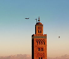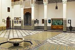 The Marrakesh area was inhabited by Berber farmers from Neolithic times, and numerous stone implements have been unearthed in the area.[7] Marrakesh was founded by Abu Bakr ibn Umar, chieftain and second cousin of the Almoravid king Yusuf ibn Tashfin (c. 1061–1106).[16][17] Historical sources cite a variety of dates for this event ranging between 1062 (454 in the Hijri calendar), according to Ibn Abi Zar and Ibn Khaldun, and 1078 (470 AH), according to Muhammad al-Idrisi.[16]:61 The date most commonly accepted by modern historians is 1070[16]:59–63[18][19]:83[20][21][22]:208[23]:22, 34 although 1062 is still cited by some writers.[24][25][26] Under the berber dynasty of the Almoravids, pious and learned warriors from the desert, numerous mosques and madrasas (Quranic schools) were built, developing the community into a trading centre for the Maghreb and sub-Saharan Africa.[27] Marrakesh grew rapidly and established itself as a cultural and religious centre, supplanting Aghmat, which had long been the capital of Haouz. Andalusian craftsmen from Cordoba and Seville built and decorated numerous palaces in the city, developing the Umayyad style characterised by carved domes and cusped arches.[7][28] This Andalusian influence merged with designs from the Sahara and West Africa, creating a unique style of architecture which was fully adapted to the Marrakesh environment. Yusuf ibn Tashfin completed the city's first mosque (the Ben Youssef mosque, named after his son), built houses, minted coins, and brought gold and silver to the city in caravans.[7] The city became the capital of the Almoravid Emirate,[29] stretching from the shores of Senegal to the centre of Spain and from the Atlantic coast to Algiers.