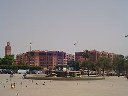 The Jemaa el-Fnaa is one of the best-known squares in Africa and is the center of city activity and trade. It has been described as a "world-famous square", "a metaphorical urban icon, a bridge between the past and the present, the place where (spectacularized) Moroccan tradition encounters modernity."[92] It has been part of the UNESCO World Heritage site since 1985.[93] The name roughly means "the assembly of trespassers" or malefactors.[94] Jemaa el-Fnaa was renovated along with much of the Marrakech city, whose walls were extended by Abu Yaqub Yusuf and particularly by Yaqub al-Mansur in 1147–1158. The surrounding mosque, palace, hospital, parade ground and gardens around the edges of the marketplace were also overhauled, and the Kasbah was fortified. Subsequently, with the fluctuating fortunes of the city, Jemaa el-Fnaa saw periods of decline and renewal.[95] Historically this square was used for public decapitations by rulers who sought to maintain their power by frightening the public. The square attracted dwellers from the surrounding desert and mountains to trade here, and stalls were raised in the square from early in its history. The square attracted tradesmen, snake charmers ("wild, dark, frenzied men with long disheveled hair falling over their naked shoulders"), dancing boys of the Chleuh Atlas tribe, and musicians playing pipes, tambourines and African drums.[94] Richard Hamilton said that Jemaa el-Fnaa once "reeked of Berber particularism, of backward-looking, ill-educated countrymen, rather than the reformist, pan-Arab internationalism and command economy that were the imagined future."[96] Today the square attracts people from a diversity of social and ethnic backgrounds and tourists from all around the world. Snake charmers, acrobats, magicians, mystics, musicians, monkey trainers, herb sellers, story-tellers, dentists, pickpockets, and entertainers in medieval garb still populate the square.[93][97]