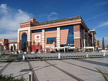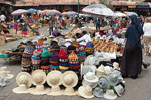 Trade and crafts are extremely important to the local tourism-fueled economy. There are 18 souks in Marrakesh, employing over 40,000 people in pottery, copperware, leather and other crafts. The souks contain a massive range of items from plastic sandals to Palestinian-style scarves imported from India or China. Local boutiques are adept at making western-style clothes using Moroccan materials.[69] The Birmingham Post comments: "The souk offers an incredible shopping experience with a myriad of narrow winding streets that lead through a series of smaller markets clustered by trade. Through the squawking chaos of the poultry market, the gory fascination of the open-air butchers' shops and the uncountable number of small and specialist traders, just wandering around the streets can pass an entire day."[67] Marrakesh has several supermarkets including Marjane Acima, Asswak Salam and Carrefour, and three major shopping centres, Al Mazar Mall, Plaza Marrakech and Marjane Square; a branch of Carrefour opened in Al Mazar Mall in 2010.[77][78] Industrial production in the city is centred in the neighbourhood of Sidi Ghanem Al Massar, containing large factories, workshops, storage depots and showrooms. Ciments Morocco, a subsidiary of a major Italian cement firm, has a factory in Marrakech.[79] The AeroExpo Marrakech International Exhibition of aeronautical industries and services is held here, as is the Riad Art Expo.