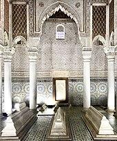 For centuries Marrakesh has been known as the location of the tombs of Morocco's seven patron saints (sebaatou rizjel). When sufism was at the height of its popularity during the late 17th-century reign of Moulay Ismail, the festival of these saints was founded by Abu Ali al-Hassan al-Yusi at the request of the sultan.[34] The tombs of several renowned figures were moved to Marrakesh to attract pilgrims, and the pilgrimage associated with the seven saints is now a firmly established institution. Pilgrims visit the tombs of the saints in a specific order, as follows: Sidi Yusuf Ali Sanhaji (1196–97), a leper; Qadi Iyyad or qadi of Ceuta (1083–1149), a theologian and author of Ash-Shifa (treatises on the virtues of Muhammad); Sidi Bel Abbas (1130–1204), known as the patron saint of the city and most revered in the region; Sidi Muhammad al-Jazuli (1465), a well known Sufi who founded the Jazuli brotherhood; Abdelaziz al-Tebaa (1508), a student of al-Jazuli; Abdallah al-Ghazwani (1528), known as Moulay al-Ksour; and Sidi Abu al-Qasim Al-Suhayli, (1185), also known as Imam al-Suhayli.[35][36] Until 1867, European Christians were not authorized to enter the city unless they acquired special permission from the sultan; east European Jews were permitted.[13]