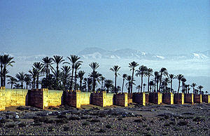 The city is located in the Tensift River valley,[56] with the Tensift River passing along the northern edge of the city. The Ourika River valley is about 30 kilometres (19 mi) south of Marrakesh.[57] The "silvery valley of the Ourika river curving north towards Marrakesh", and the "red heights of Jebel Yagour still capped with snow" to the south are sights in this area.[58] David Prescott Barrows, who describes Marrakesh as Morocco's "strangest city", describes the landscape in the following terms: "The city lies some fifteen or twenty miles [25–30 km] from the foot of the Atlas mountains, which here rise to their grandest proportions. The spectacle of the mountains is superb. Through the clear desert air the eye can follow the rugged contours of the range for great distances to the north and eastward. The winter snows mantle them with white, and the turquoise sky gives a setting for their grey rocks and gleaming caps that is of unrivaled beauty."[40]