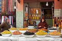 One of the largest souks is Souk Semmarine, which sells everything from brightly coloured bejewelled sandals and slippers and leather pouffes to jewellery and kaftans.[100] Souk Ableuh contains stalls which specialize in lemons, chilis, capers, pickles, green, red, and black olives, and mint, a common ingredient of Moroccan cuisine and tea. Similarly, Souk Kchacha specializes in dried fruit and nuts, including dates, figs, walnuts, cashews and apricots.[101] Rahba Qedima contains stalls selling hand-woven baskets, natural perfumes, knitted hats, scarves, tee shirts, Ramadan tea, ginseng, and alligator and iguana skins. Criee Berbiere, to the northeast of this market, is noted for its dark Berber carpets and rugs.[100] Souk Siyyaghin is known for its jewellery, and Souk Smata nearby is noted for its extensive collection of babouches and belts. Souk Cherratine specializes in leatherware, and Souk Belaarif sells modern consumer goods.[99] Souk Haddadine specializes in ironware and lanterns.[102]