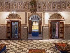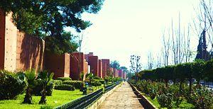 The medina has at least eight main historic gates: Bab Doukkala, Bab el-Khemis, Bab ad-Debbagh, Bab Aylan, Bab Aghmat, Bab er-Robb, Bab el-Makhzen and Bab el-'Arissa. These date back to the 12th century during the Almoravid period but many have them have been modified since.[105][22] Bab Doukkala (in the northwestern part of the city wall) is in general more massive but less ornamented than the other gates; it takes its name from Doukkala area on the Atlantic coast, well to the north of Marrakesh.[106] Bab el-Khemis is in the medina's northeastern corner and is named for the open-air Thursday market (Souq el Khemis).[22][105] It is one of the city's main gates and features a man-made spring.[107] Bab ad-Debbagh, to the east, has one of the most complex layouts of any gate, with an interior passage that turns multiple times.[105] Bab Aylan is located slightly further south of it.[105] Bab Aghmat is one of the city's main southern gates, located east of the Jewish and Muslim cemeteries and near the tomb of Ali ibn Yusuf.[108] Bab er Robb is the other main southern exit from the city, located near Bab Agnaou. It has a curious position and layout which may be the result of multiple modifications to the surrounding area over the years.[105][22] It provides access to roads leading to the mountain towns of Amizmiz and Asni.