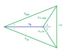 Which gives a value for V ∞ of 6.54 km/s. The turn angle δ can be calculated from:
