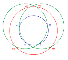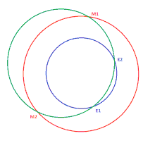 Earth orbits the Sun in one Earth year, Mars in 1.881. Neither orbit is perfectly circular; Earth has an orbital eccentricity of 0.0168, and Mars of 0.0934. The two orbits are not quite coplanar either, as the orbit of Mars in inclined by 1.85 degrees to that of Earth. The effect of the gravity of Mars on the cycler orbits is almost negligible, but that of the far more massive Earth needs to be considered. If we ignore these factors, and approximate Mars's orbital period as 1.875 Earth years, then 15 Earth years is 8 Martian years. In the diagram opposite, a spacecraft in an Aldrin cycler orbit that starts from Earth at point E1 will encounter Mars at M1. When it gets back to E1 just over two Earth years later, Earth will no longer be there, but it will encounter Earth again at E2, which is 51.4 degrees, 1&fras1;7 of an Earth orbit, further round.[9]