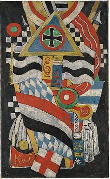 In April 1913 Hartley relocated to Berlin, the capital of the German Empire, where he continued to paint and befriended the painters Wassily Kandinsky and Franz Marc.[2] He also collected Bavarian folk art.[10] His work during this period was a combination of abstraction and German Expressionism, fueled by his personal brand of mysticism.[2] Many of Hartley's Berlin paintings were further inspired by the German military pageantry then on display, though his view of this subject changed after the outbreak of World War I, once war was no longer "a romantic but a real reality".[10] The earliest of his Berlin paintings were shown in the landmark 1913 Armory Show in New York.[4]