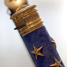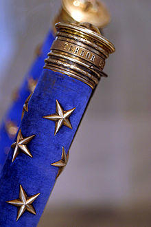 A Marshal of France displays seven stars on each shoulder strap. A marshal also receives a baton: a blue cylinder with stars, formerly fleurs-de-lis during the monarchy and eagles during the First French Empire. The baton bears the Latin inscription of Terror belli, decus pacis, which means "terror in war, ornament in peace".