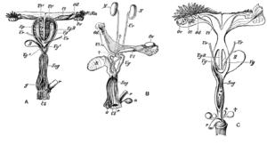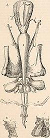 Most male marsupials, except for macropods[13] and marsupial moles,[14] have a bifurcated penis, separated into two columns, so that the penis has two ends corresponding to the females' two vaginas.[9][12][15][16][10][17][18] The penis is used only during copulation, and is separate from the urinary tract.[10][12] It curves forward when erect,[19] and when not erect, it is retracted into the body in an S-shaped curve.[10] Neither marsupials nor monotremes possess a baculum.[9] The shape of the glans penis varies among marsupial species.[10][20][21][22]